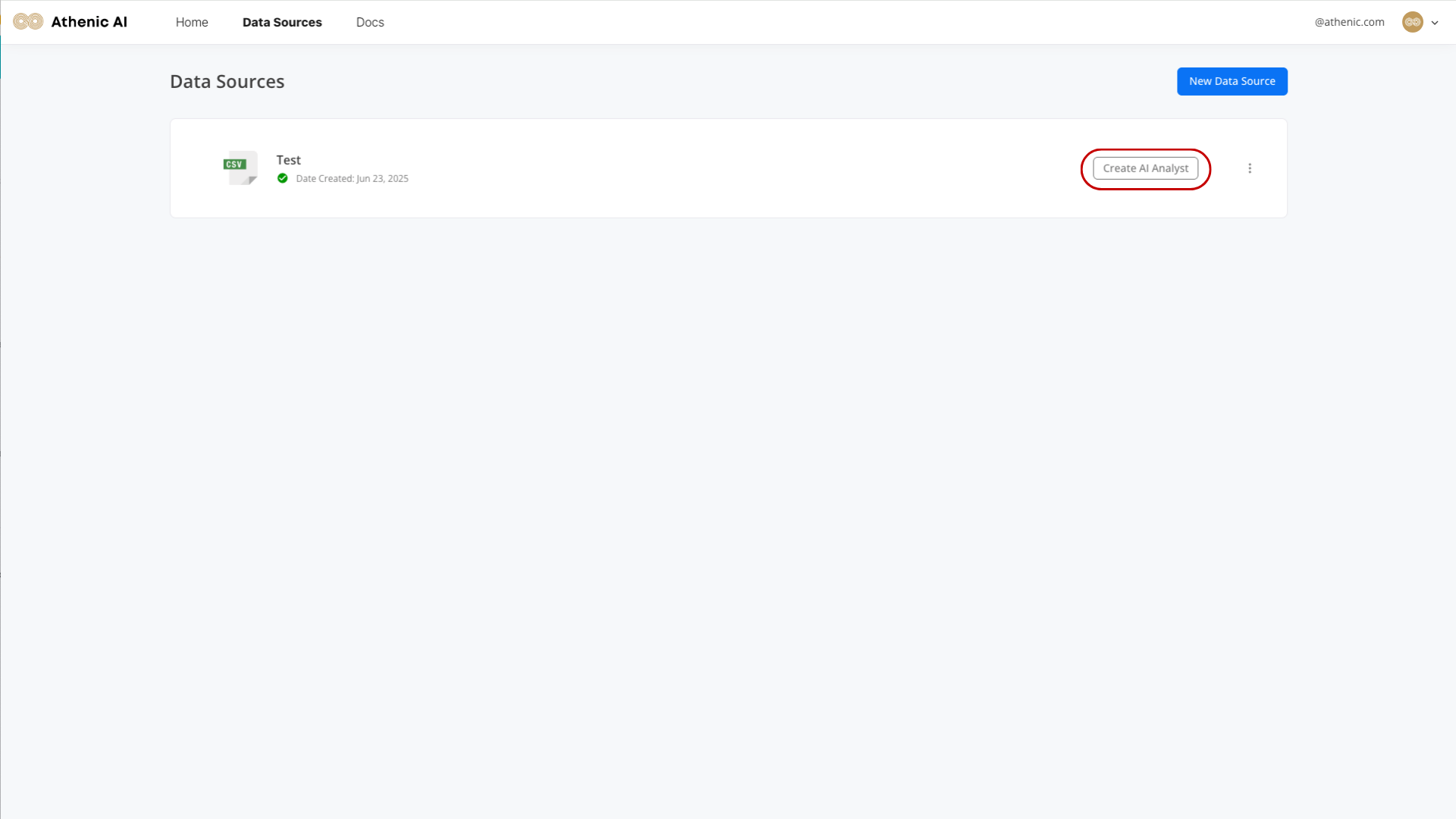 Start by selecting an existing data source or uploading a new one. Athenic supports multiple formats, including CSV uploads and database connections.