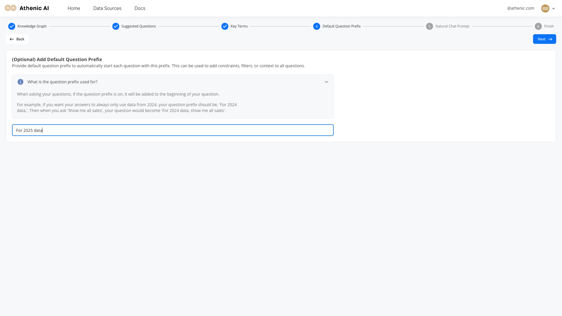 You can optionally set Default Question Prefixes to automatically add filters or context to every question. This is useful when there’s a default business assumption that should apply unless stated otherwise.