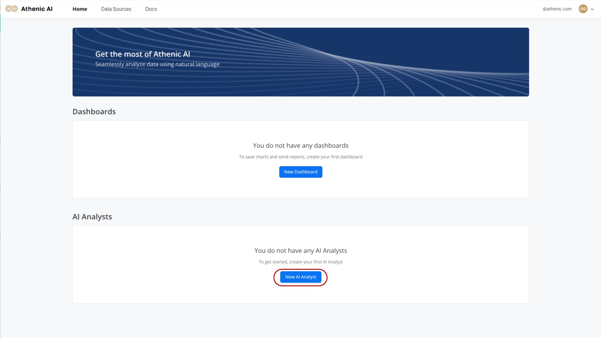 * From the **Data Sources** page: click **"Create AI Analyst" (if you have already connected your Data Source)**