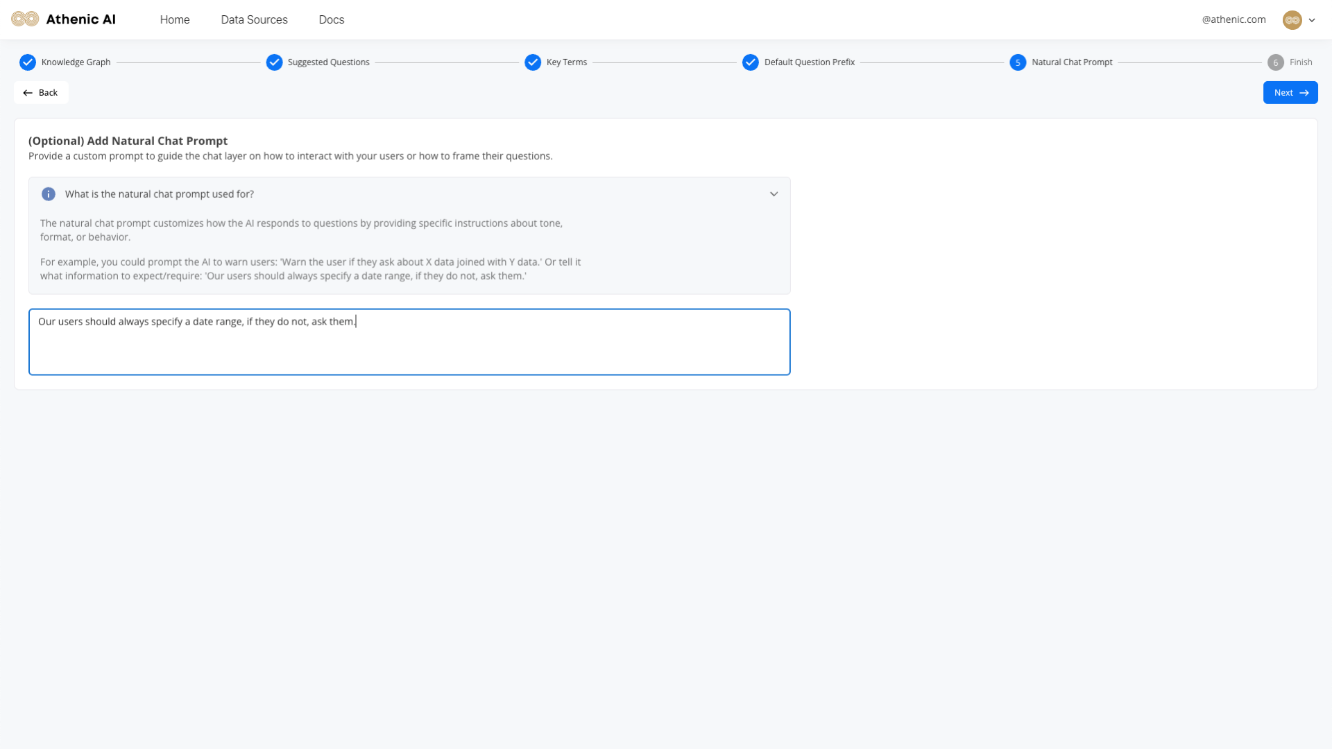 Guide how the AI interacts with users by setting a custom prompt. Use it to define tone, behavior, or requirements—e.g., “Ask for a date range if not provided,” or “Warn if X data is joined with Y.”