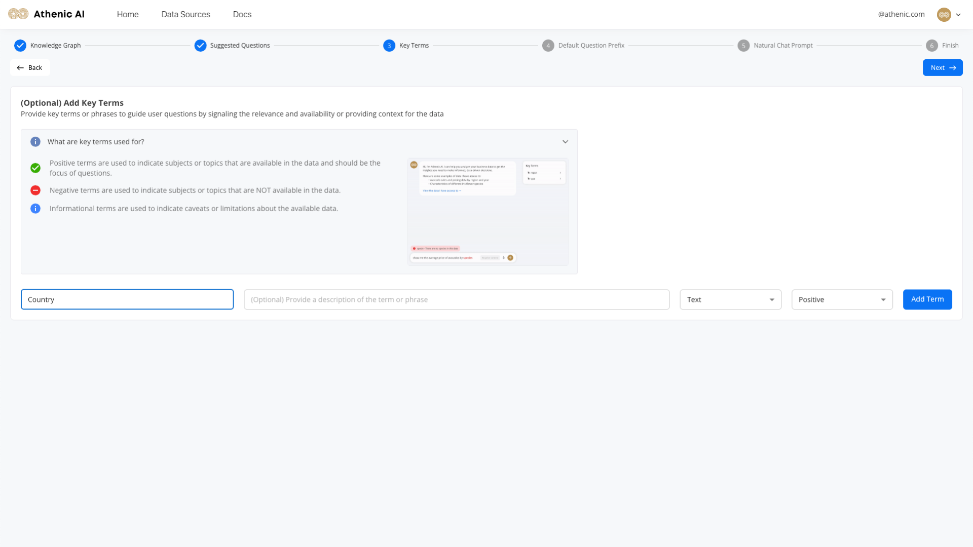 Key terms help guide users as they type questions—especially those less familiar with the data. Admins can define specific business terms (like “churned customers” or “Q1 revenue”) and provide helpful descriptions or context.